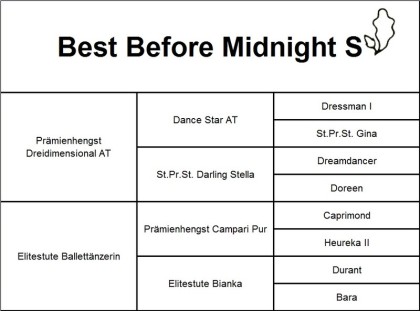 Mutter von Best Before Midnight S ist unsere Elitestute Ballettänzerin von Campari Pur- Durant – Nadler, welche bereits zwei gekörte Hengste und mehrere Staatsprämienstute, u.a. die diesjährige Endringstute Beauty in Motion von Stukhuster Ricardo Go for Gold auf der Staatsprämienauswahl in Adelheidsdorf stellte und inzwischen aufgrund der erfolgreich abgelegten Stutenleistungsprüfung Staatsprämienstute ist.