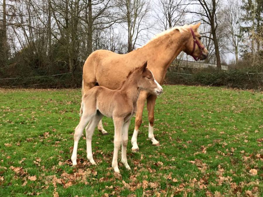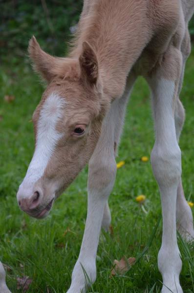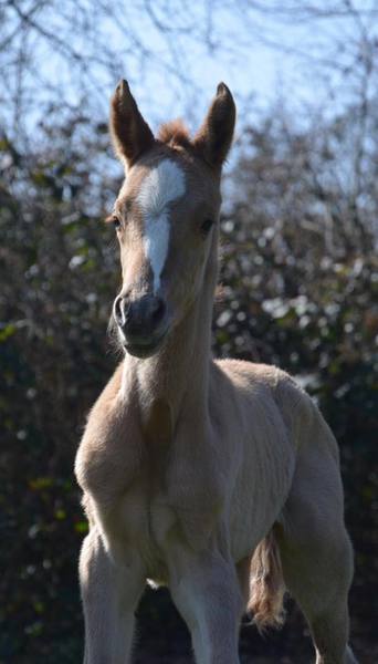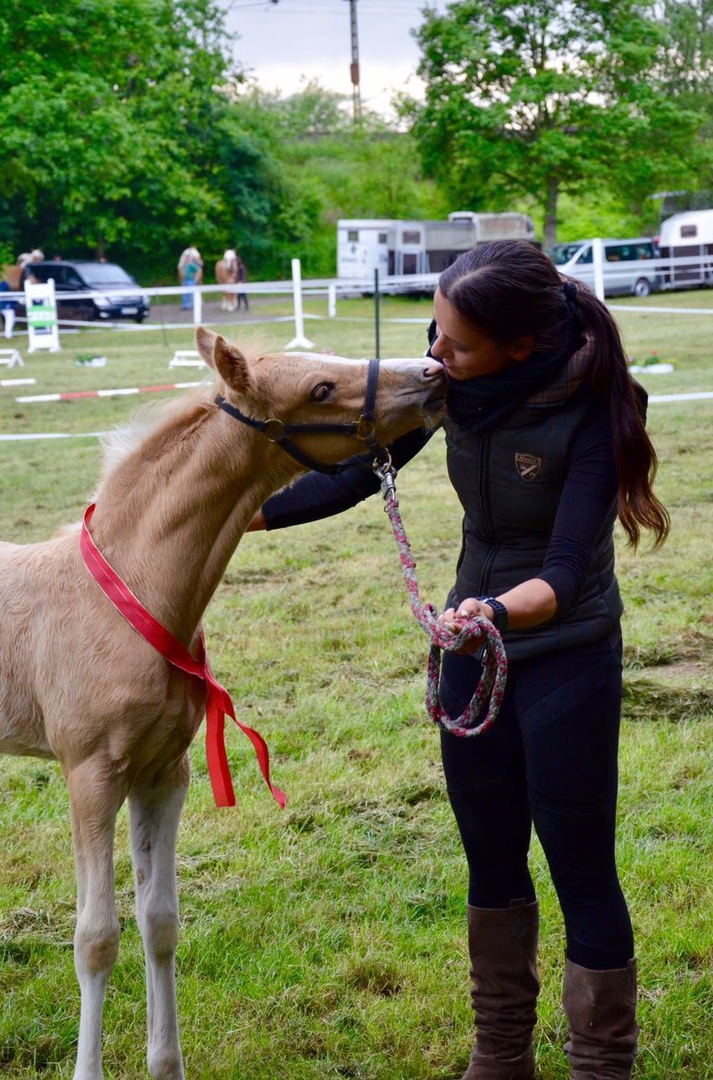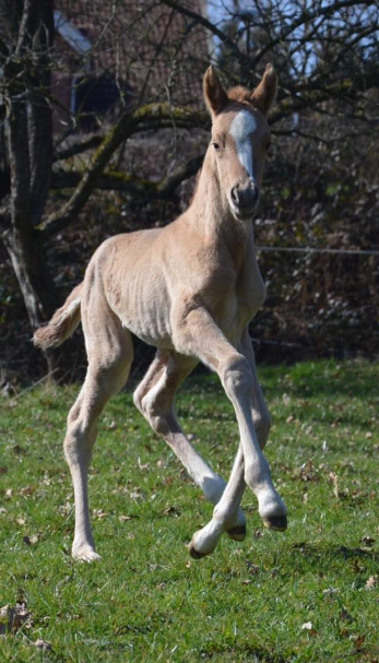 Es handelt sich um eine wunderschönes und langbeiniges Fuchsfalbstutfohlen vom rheinischen Prämienhengst und mehrfachen Bundeschampionatsteilnehmer Mac Creamy (Casino Royal K - Dornik B - Brandy).