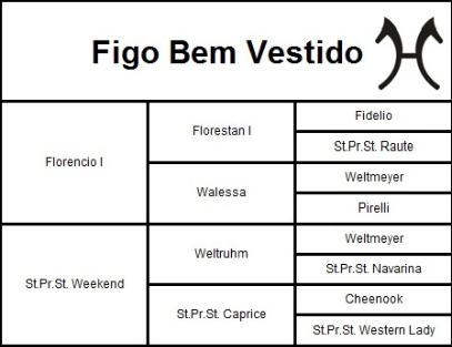 Vater von Figo ist Florencio I, welcher über herausragende Nachzucht verfügt. Die gekörten Hengste Charmeur, Fürst Nymphenburg, Florenciano, Fabregas, Fackeltanz oder Florisount sind allesamt Söhne des Florencio I. Insgesamt zählen über 20 gekörte Hengste zu seinen Nachkommen. Aber auch außergewöhliche Stuten haben Florencio I zum Vater. So stellte er anlässliche der Elitestutenschau 2010 in Rastede 10 Stuten und war damit Hauptbeschicker dieser Auswahl. Die Vize-Bundeschampionesse Alice OLD ist ebenfalls eine Tochter des Florencio I. Aber auch im Sport hat der Hengst deutliche Spuren hinterlassen. 2004 war der mit Rekordbewertung Welstmeister der jungen Dressurpferde in Verden. Ein Jahr später konnte Florencio I diesen Titel sogar verteidigen. Inzwischen ist er hocherfolgreich in schwersten Dressurprüfungen unterwegs.