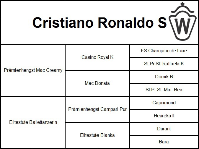 Cristiano Ronaldo S ist im Jahr 2014 geboren und ein Sohn des rheinischen Prämienhengstes Mac Creamy, welcher auf dem Bundeschampionat das Rheinische Pferdestammburch als drei- und vierjähriger Hengst vertrat.