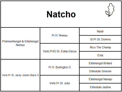Vater von Natcho ist der bekannte Prämienhengst Nemax, welcher bereits als junges Pferd auf dem Bundeschampionat sehr erfolgreich in Dressur und Springen vorgestellt wurde. Inzwischen ist er in Dressurprüfungen der Klasse S angekommen und auch vorne platziert. Nemax Vater Niveau konnte ebenfalls zahlreiche Siege und Platzierungen bis zur Kl. M in Dressur und Springen gegen Großpferde verbuchen. Er wurde erst 11-jährig aufgrund seiner herausragenden sportlichen Eigenleistung in Verden gekört. Niveau kann mehrere gekörte Söhne sowie Championatssiegerfohlen vorweisen. Der Hengst lieferte bei wenigen Nachkommen mehrere Spitzen-Turnierponys, die u.a. erfolgreich am Bundeschampionat in Dressur und Springen teilnahmen und sich in Dressur und Springen bis zur Kl. M und S platzieren konnten. 2007 wurde Niveau anlässlich des Niedersächsischen Fohlenchampionats durch seine erfolgreiche Nachzucht zum Siegerhengst gekürt. Seine große Leistungsbereitschaft und seinen tollen Charakter hat Niveau stets seinen Nachkommen und so auch Nemax weitergegeben.