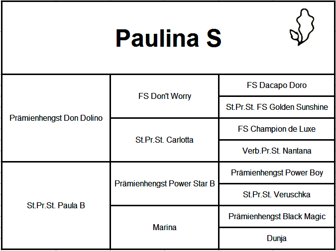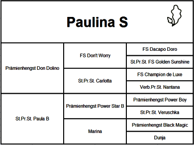 Paulina S ist eine Tochter des bundeschampionatserfolgreichen Don Dolino, welcher bereits aus seinem ersten Jahrgang einige gekörte Hengste und Staatsprämienstuten vorweisen kann. Allen voran der Hannoversche Prämienhengst Don Diego, welcher das Verderner Publikum anlässlich seiner Körung im Jahr 2013 gegeisterte.