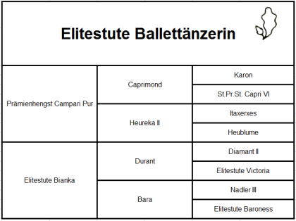 Sie stammt ab vom dem Trakehnerhengst Campari Pur, welcher das Blut des berühmten Grand-Prix-Hengstes Caprimond und des HLP-Siegers und ebenfalls in S-Dressuren erfolgreichen Itaexerxes vereint.